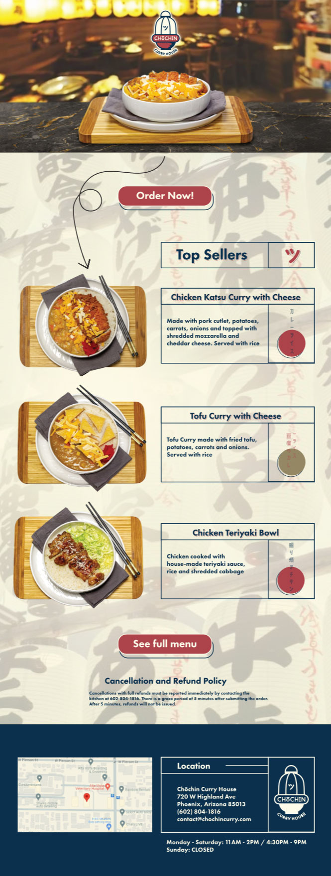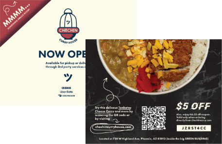 Chōchin Curry House was a three month proof of concept to test initial interest in a Japanese curry house in the Phoenix Metro area. Within three months of opening the concept, the restaurant was already turning noticeable profits. This project had an extremely fast turnaround and included everything from naming, logo design, web design, social media, menu design and food photography.